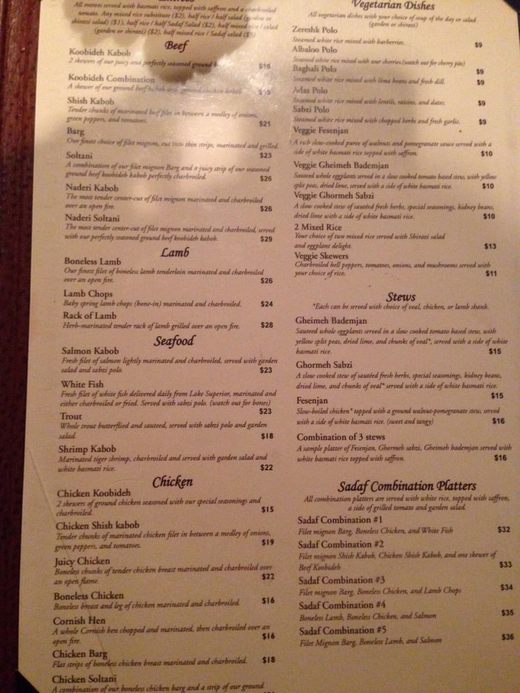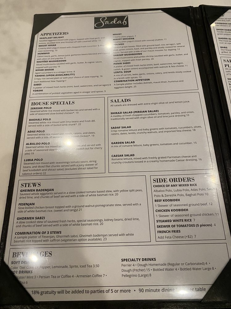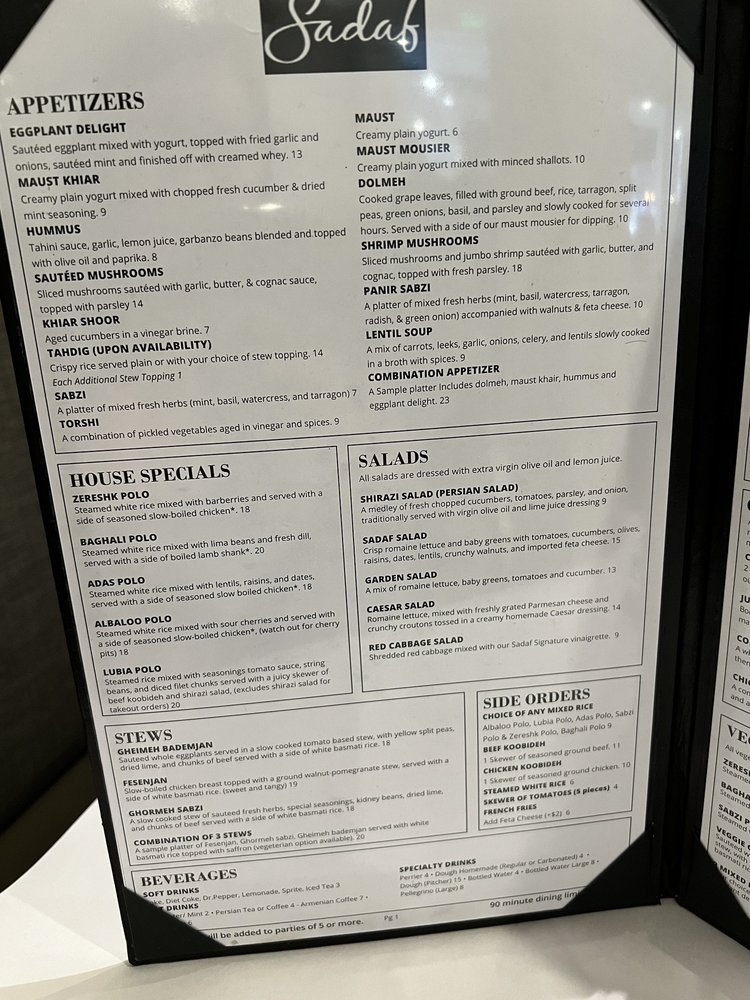 Sadaf Restaurant, located in Encino, CA, is a Persian/Iranian and Middle Eastern cocktail bar that boasts a wide variety of amenities. From offering delivery and takeout to catering and outdoor seating, Sadaf provides a welcoming and inclusive dining experience for all. With a menu featuring delectable cocktails like the Sadaf Martini and Dizin Soju, as well as savory dishes like beef and chicken koobideh and Eggplant Delight, this establishment has garnered high praise from satisfied customers. The consistent quality of the food, top-notch service, and warm ambiance set Sadaf apart as a must-visit destination for lovers of Persian cuisine. Whether you're looking for a leisurely lunch or a lively night out, Sadaf Restaurant delivers exceptional flavors and unforgettable dining experiences every time.